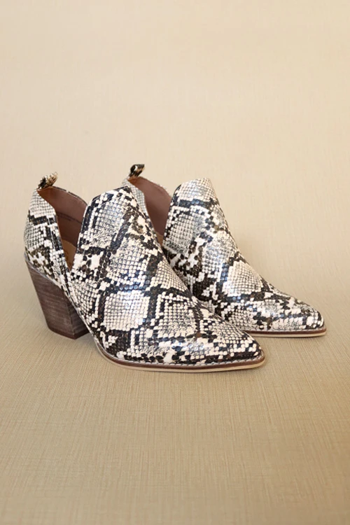 Ankle booties. V shaped side cutouts. Faux leather material in a stunning python snake print. Closed toe. Chunky block heel that’s just the perfect height. Not too high – keeping them super comfortable. Grab a pair of these must-have booties this season. You won’t regret it!