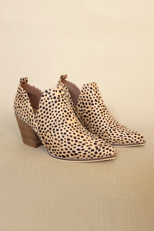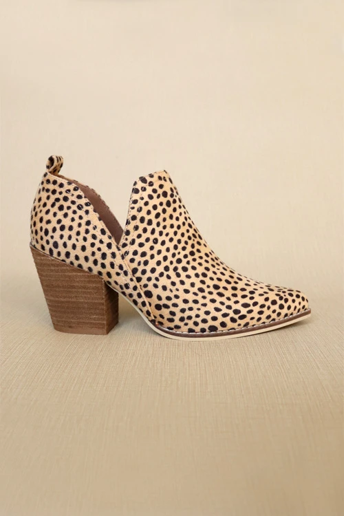 Ankle booties. V shaped side cutouts. Faux leather material in a stunning leopard cheetah print. Closed toe. Chunky block heel that’s just the perfect height. Not too high – keeping them super comfortable. Grab a pair of these must-have booties this season. You won’t regret it!