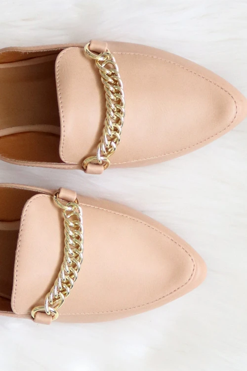 toe slides. Casual flat mules with an accent chain across the top.