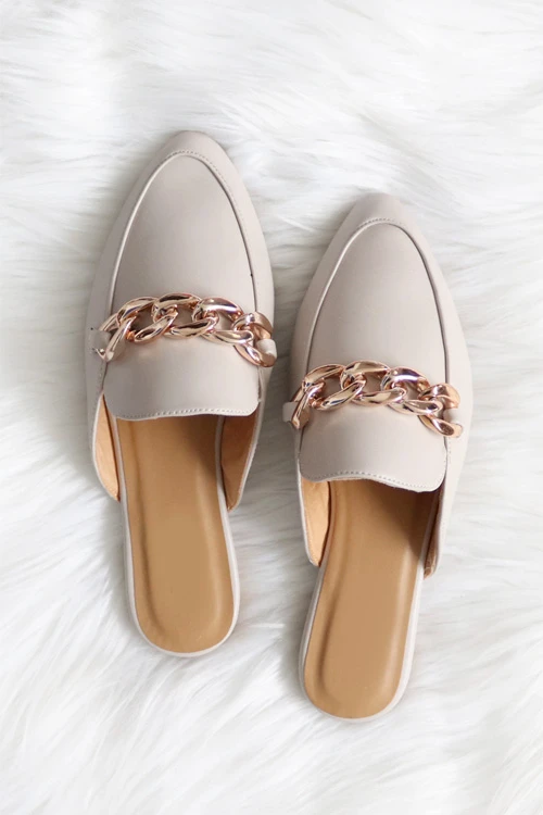 Pointy toe slides. Casual flat mules with a chunky chain across the top. Closed toe. Open slip on back. An effortless but chic accessory to any outfit!
