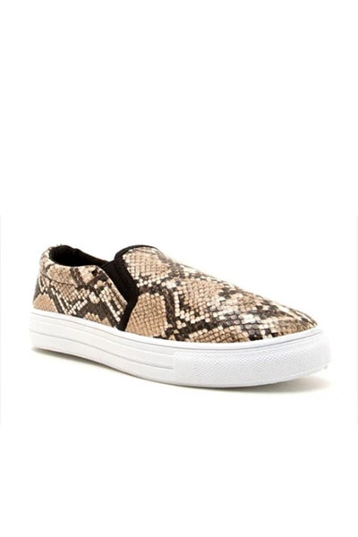 Casual slip on shoes. Unique brown snake print design adds a little flair to your outfit. Contrasting white sole. Comfortable and super easy to throw on and run around, without sacrificing style.