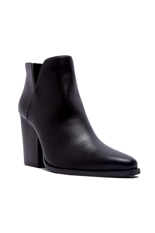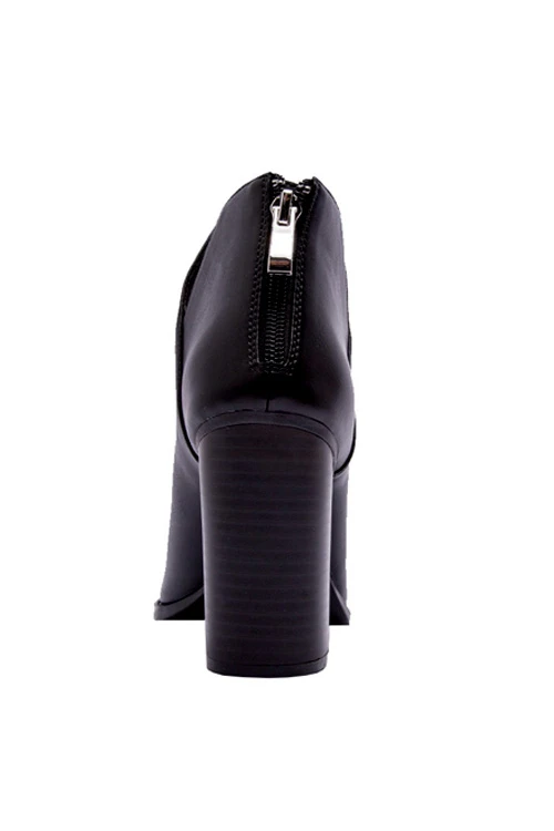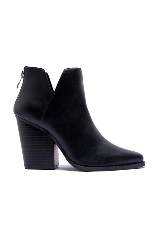 toe ankle booties. Closed toe. Side cut out at the ankles. Chunky wooden block heel. Faux leather material. Zipper closure at the back. An effortless and super stylish pair of booties that will be a staple in your fall and winter wardrobe.