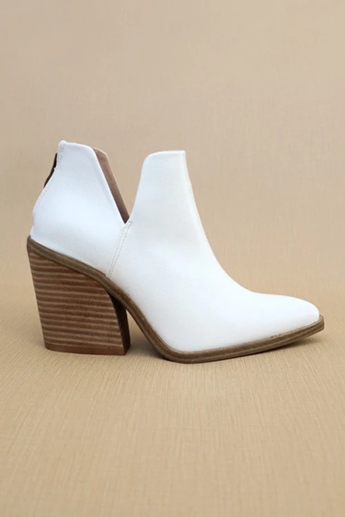 toe ankle booties. Closed toe. Side cut out at the ankles. Chunky wooden block heel. Faux leather material. Zipper closure at the back. An effortless and super stylish pair of booties that will be a staple in your fall and winter wardrobe.