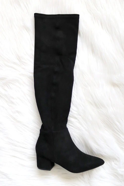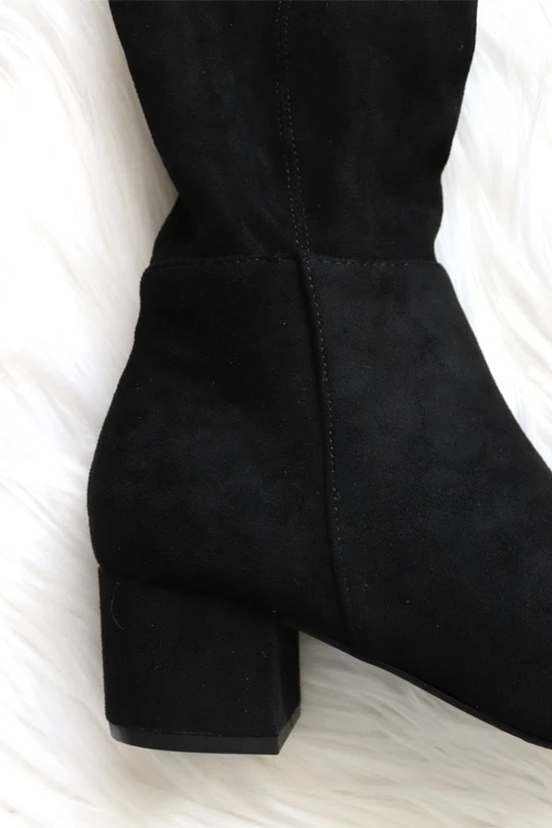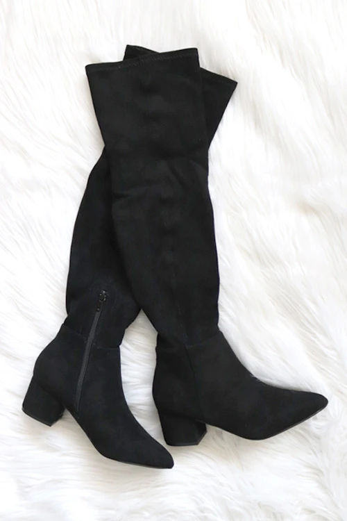 Over the knee ankle boots. Faux suede material. Stretchy material with side zipper closure. Pointy toe. Low heel for comfort and style.