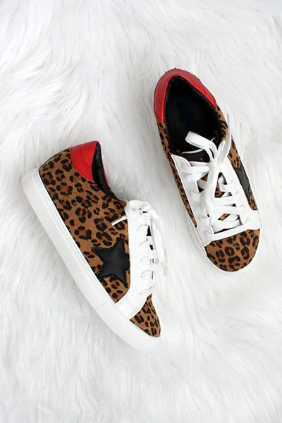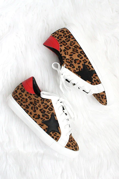 Low top sneakers. Bold leopard print faux suede material on the sides with a star accent. Light grey faux suede material in the center. Metallic silver shoe