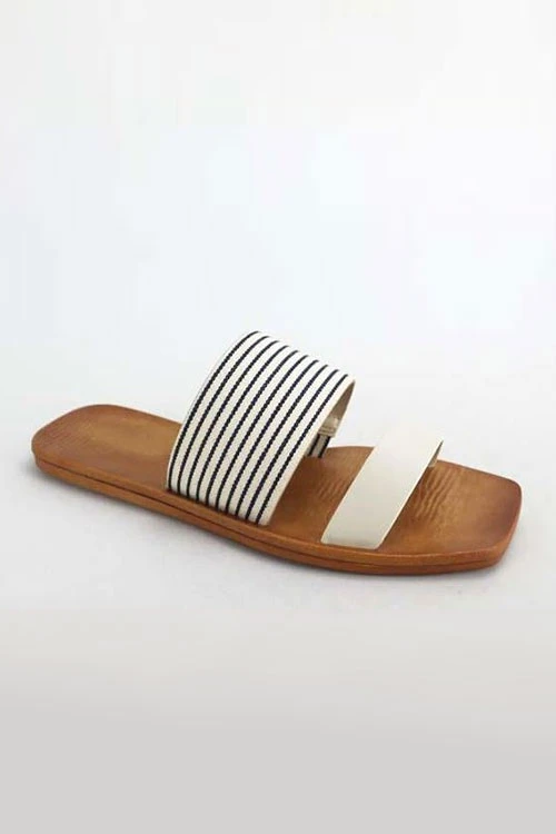 A basic and chic pair of sandals that can be worn every day! Two bands across the top. A fun mix of colors – one solid strap and thicker striped strap. Open Toe. Flat Sole.