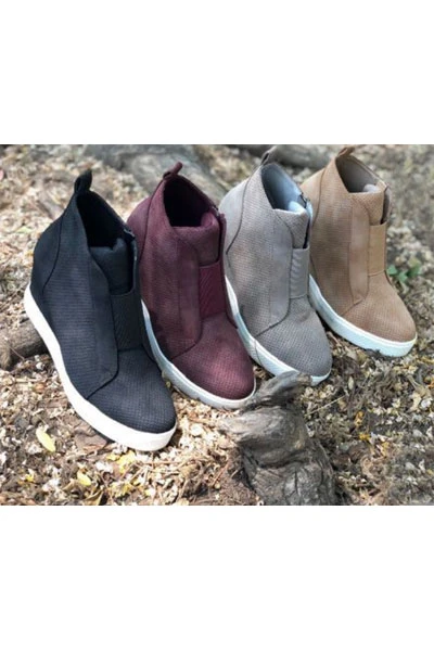 Wedge sneakers. Perforated faux suede material. Contrasting white sole. Elastic across the top. Get the casual look of sneakers while adding a little height to your look. Grab these popular on-trend sneakers while you can!