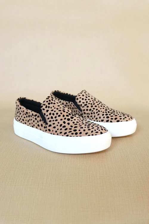 Casual slip on shoes. Platform sole end unique animal print adds a little fun to any outfit! Contrasting white sole.