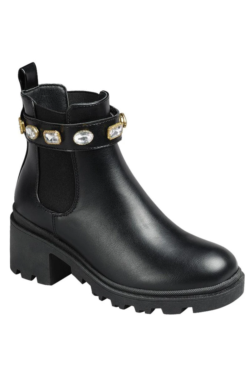 Rhinestone Ankle Chelsea Boots With Lug Sole Chunky Heel-Black
