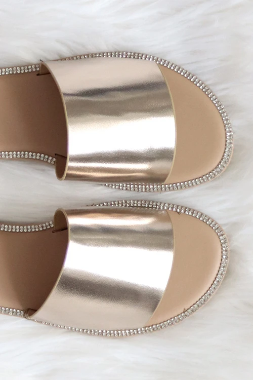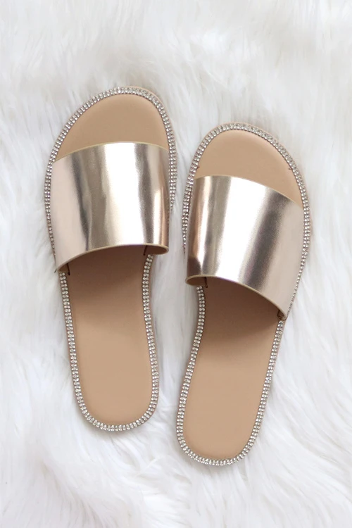 Single band sandals. Rhinestone accent along the border of the sole for a detailed touch. Solid band across the top. The perfect basic slides with just a little extra detail to make these stand out! Effortless and comfortable. Just enough bling without being over the top!