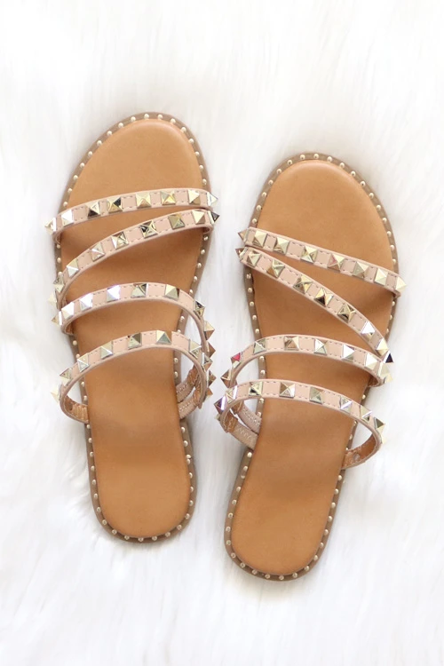 It’s all in the details! Stylish strappy studded sandals. Four strap design with horizontal and diagonal studded straps. Taupe straps with gorgeous studded detail. Slip on style. Round studded trim along the border of the sole.