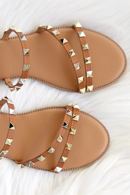 Strappy Studded Sandals With Diagonal Straps-Camel Brown