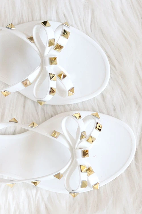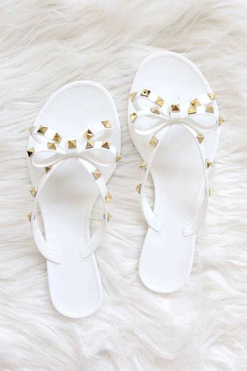 Casual and chic flip flop sandals. Jelly material. Adorable bow detail. Studded accent along the straps and bow. These fun, casual shoes will compliment any outfit. Pair it with t-shirt and jeans, or cut off shorts for an effortlessly chic look. Or dress it up with a cute summer dress. Goes well with anything!