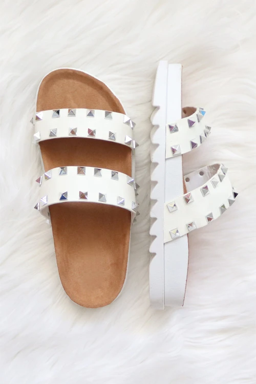 Double strap sandals. Square studded design. Platform sole. Throw on these slides with a pair of cut off shorts for an easy stylish look!