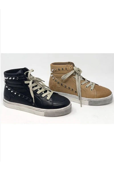 High top sneakers. Fun studded accent. Finished off with a black star. Lace up detailing. A casual and fun pair of sneakers that will add a little flair to any outfit.