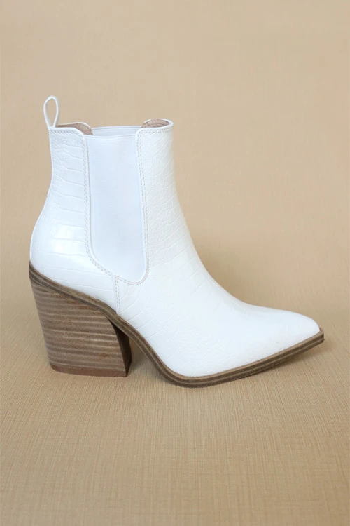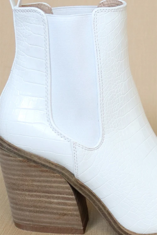 Tall ankle booties. Side elastic. Closed pointy toe. Medium height stacked wooden heel. The perfect height – gives you a little height without sacrificing comfort. Faux leather material. Gorgeous embossed crocodile texture.