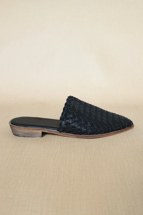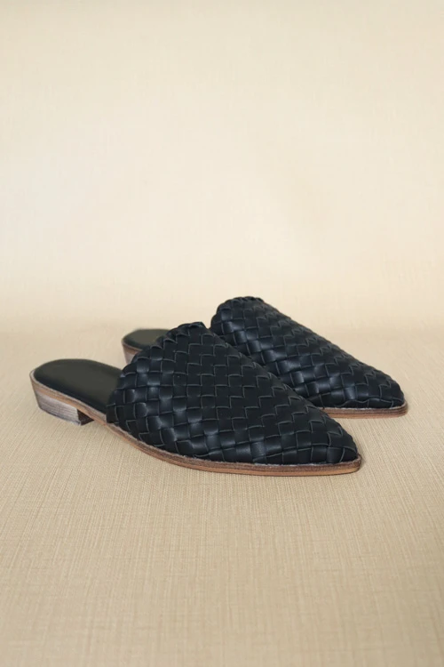 Pointy toe slides. Casual flat woven mules. Gorgeous weaved faux leather material. Closed toe. Open slip on back. Effortless, chic, and simply perfect for any outfit.